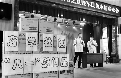 上周,东城区交道口街道府学社区联合工会携手南锣职工曲艺社在武警一支队召开了以“科普之夏暨军民鱼水情”为主题的联欢会,曲艺爱好者、职工、武警官兵及社区居民近百人参加。府学社区联合工会不仅为武警一支队的官兵送来了慰问演出,还一并送上慰问品,感谢他们给予社区的支持。本报记者 万玉藻 摄影报道