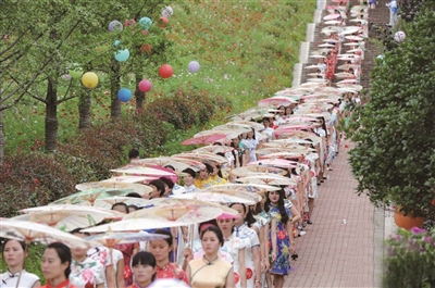 近日,中国凉都旗袍文化节在贵州省六盘水市举行,3000余名来自全国各地的旗袍佳丽在六盘水明湖湿地公园长达1.13公里的景观桥上走秀,构成目前现场参与人数最多、延绵距离最长的世界旗袍秀。图为旗袍佳丽在走秀。