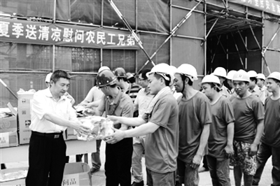 “师傅们,你们辛苦啦!”近日,德胜街道总工会主席来到在地区施工的河北建设集团项目部,对参加建设北京科学中心的农民工表示了慰问,并给农民工送去了西瓜、绿豆、白糖等防暑降温品、日常用品及各类劳保用品。农民工看着送来的实用的防暑降温用品,脸上洋溢着幸福的笑容。