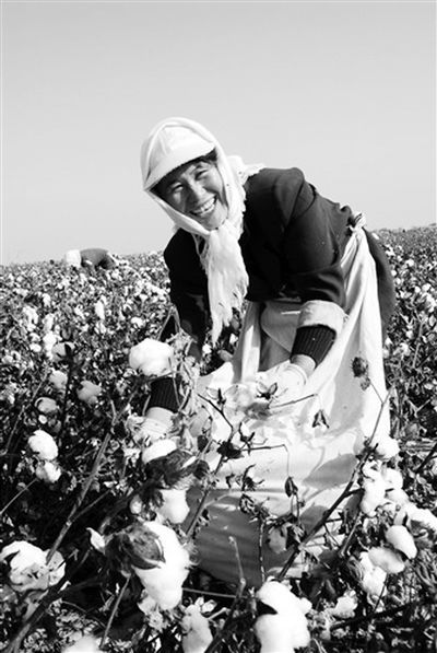 摘棉花最好等晨露过后,棉球上不沾一丝露水,这时采摘的棉花松软漂亮,而且容易晒干。走进棉田,母亲把竹篓放在田埂边上,把包袱拿出来抖了抖,递给我一个,我照着她的样子将包袱系在腰间,一人负责一垄棉,开始畅快地摘起棉花来。母亲对摘棉花驾轻就熟,她左手执起棉球,右手五个手指分散开抓在棉瓣上,轻轻一提,棉花便顺从地到了她的右手上,她把采好的棉花往面前的包袱里一塞,又继续弯腰采摘,她身上的那个棉袋子便越来越重起来。待感觉身上沉重不便走路了,便走到竹篓边,把袋子解开,棉花便一骨脑儿钻进篓子里。她直了直腰,重新系好棉袋,用双手又捶了捶腰部,重新钻进棉田。