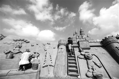 从8月中旬开始,“沙绘G20”舟山国际沙雕展在浙江舟山朱家尖南沙景区开雕,来自中国、荷兰、加拿大、西班牙、捷克等数十名中外沙雕手共同用沙雕打造中国、俄罗斯、美国、德国、印度尼西亚等国的特色景观、城市风貌以及经典动漫形象,营造出沙雕“地球村”的美丽场景,为即将在浙江杭州举行的G20峰会增添气氛。预计展览将在9月初完成并向游客正式开放。图为沙雕手们正在创作美国迪斯尼题材的沙雕作品。新华社发