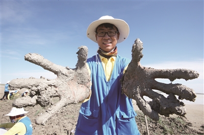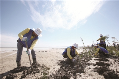 “种植芦苇是在一个逐渐干涸的湖边,脚下是含碱量很高的泥,挖坑的时候一铲子下去,坑没挖好,穿着雨鞋的双脚却陷入泥中20-30厘米深,由于泥土很粘,鞋子拔起来也特别费劲,有时候得几个人合力才能救出深陷泥潭的同伴。陷进去了无数次,铁锹铲不动了,就用铁锹柄钻洞。就这样,虽然艰辛,每个人都认真负责地种下每一棵芦苇。”贾彦舶说。