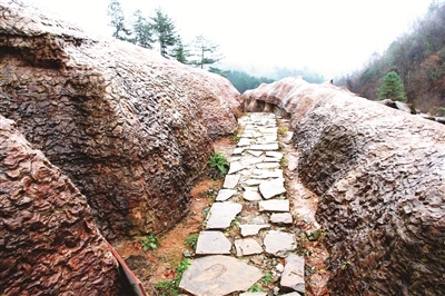 “中华龙山”当是这山这石的点睛之笔,山体岩石呈朴素的红褐色,龙鳞似的石纹布满整个表面。在山石的表层,遥远年代的海洋生物化石随处可见。地形或平或缓,或峡或洞,或坡或峰。其状如龙爪,似龙头,若龙飞,像龙脊,被地质专家称为“龙脊地貌”,是世界罕见的地质奇观。“中华龙山”几个字,极自然地分布在一条石龙身上,既飘逸潇洒,又朴拙雅致,用“画龙点睛”来形容一点也不为过。