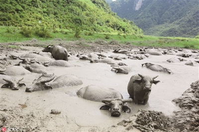 虽然已经过了立秋,但天气仍然高烧不退,中国南部部分地区备受高温的“煎熬”,烧烤模式继续。在湖北省恩施土家族苗族自治州宣恩县椒园镇洗草坝村,上百头水牛集结在大坝有限的黄泥塘里,用黄泥覆盖全身,共洗“黄泥浴”,享受一种难得的清爽。