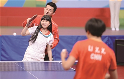 8月28日,里约奥运会内地奥运精英代表团的乒乓球、羽毛球运动员在香港伊利沙伯体育馆与市民互动,并带来示范表演。据悉,此次代表团一行共有64人,他们于27日起在港展开为期3天的访问,期间将出席示范表演节目及综艺节目,并与市民及本地运动员进行多轮互动交流。图为乒乓球运动员张继科(后)指导粉丝与李晓霞“对决”。