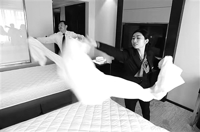 在客房部经理进行赛前规则讲解后,比赛正式开始。参赛职工各自亮出精彩“绝活”,比拼铺床技能。客房部员工率先开始,白床单被抛到空中,如同白色锦缎在空中飞舞,动作干净、漂亮。铺好的床的四角平整,包边成90度,被子在被套中饱满、平展,羽绒被在床头翻折45厘米,羽绒枕、床单、被罩三个中线合一。一套连贯的动作下来,不过3分钟的时间就能铺好光滑、平整的床面。