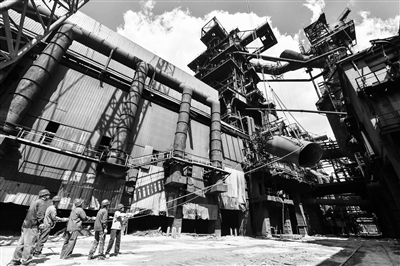 8月31日上午,包头钢铁集团炼铁厂2号高炉拆除工作正式启动,这是全国钢铁行业推进去产能以来拆除的最大一座高炉,可压减炼铁产能133万吨。图为施工人员在地面牵引被拆除的2号高炉下降管。新华社发