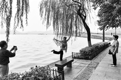9月1日0时至6日24时,浙江省杭州市西湖景区封闭管理区域将停止对外开放,仅封闭管理区域内的居民和从业单位人员,凭有效身份证件及通行证,经过安检方可通过。图为西湖景区封闭管理区域内的居民在西湖边拍照。新华社发
