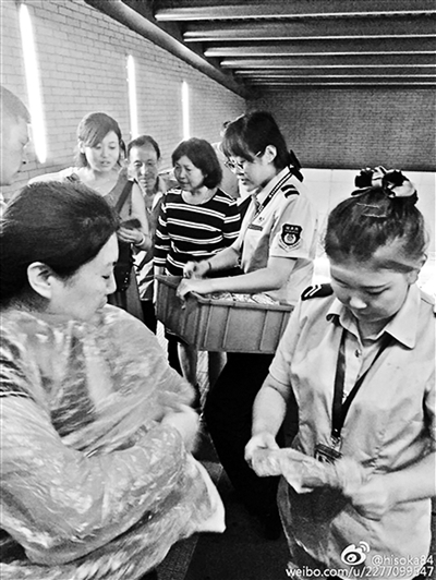9月7日晚高峰,一场突如其来的急雨让市民措手不及,可不少暖心的事情也在发生。众多市民反映,在客流量最大的晚高峰,北京地铁各个车站第一时间为乘客送上一次性雨衣,在雨中感受温暖。北京青年报记者了解到,恶劣天气送雨衣是地铁的常规性服务。京港地铁相关负责人介绍,平时各地铁站内都备有雨衣,突发雨情时,乘客可以在5至10分钟内获得免费雨衣。(9月8日《北京青年报》)