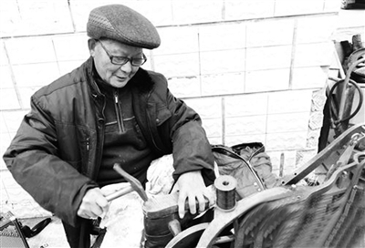 自从买了老城区的二手房后,我经常路过街边巷子口的鞋档。不管刮风下雨,寒来暑往,总能见一位老者准时出摊。他做事专注,轻捶细敲,拿着鞋子在小缝纫器上“飞针走线”,然后用胶粘、对着光照、用手摩挲修补过的部位。最后觉得满意了,才算大功告成。
