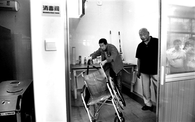 在温馨家园的清洗间,工作人员正使用专业的机械对轮椅进行臭氧清洗。清洗间外,还有两三位坐着轮椅的残疾人排队等待。