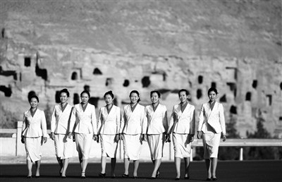近日,敦煌研究院上百名莫高窟讲解员和数字展示中心接待员经过培训后,身着具有敦煌壁画服饰元素的全新工作制服亮相,为前来参观的游客提供中、英、日、法、韩、德6种语言的接待讲解,新颖别致的服装既方便了游客识别工作人员,也成为景区内一道靓丽的风景。新华社发