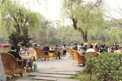 我们边喝边聊,突然,几个穿着讲究的人坐在我旁边,他们点茶后,打开带来的电脑,我以为他们要在茶馆玩电脑,但我错了。开电脑的人把电脑转给另一个,说,李老板,这是我们各类产品的报价,你看看,需要哪几种。哟,原来是在做生意……我原以为,来茶馆的都是休闲玩耍,想不到还是一个工作场所。亲戚见我看邻桌出神,就告诉我,在茶馆“办公”,是成都人的一大爱好,很多事情都是在茶桌上搞掂的。