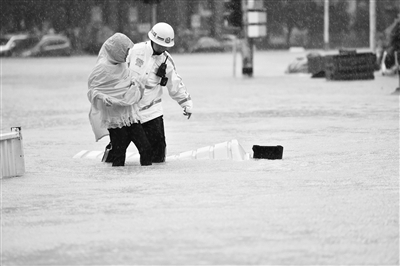 9月28日,今年第17号台风“鲇鱼”4时40分在福建省惠安沿海登陆。中央气象台6时发布台风橙色预警和暴雨橙色预警,提醒相关地区和部门做好防台风抢险应急工作。图为福州交警支队屏山大队民警叶明海帮助转移一位涉水头晕的妇女。新华社发