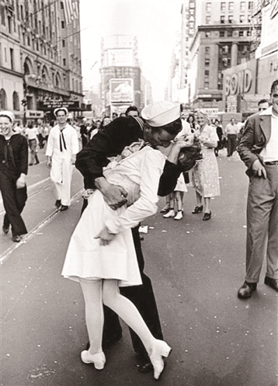 纽约时间1945年8月14日,美国迎来对日作战的二战胜利日,许多民众走到纽约时报广场。一名水兵拥吻一名穿白色外衣的女士,被一名路过的摄影师抓拍下来。这一照片后来成为象征美国二战结束的经典照片。