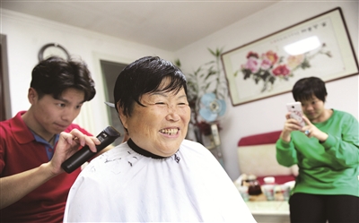 昨天是重阳节,由丰台区卢沟桥地区总工会搭台、企业参与、劳模乐享的上门义务美发活动正式启动,退休的劳模们在家就享受到了专业级别的美容美发服务。图为退休劳模任秀英在家中享受美容美发服务。