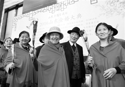 10月9日,来自山东各地的99对金婚老人在济南举行2016年山东金婚大典,共同庆祝相濡以沫一起走过的50年婚姻生活和重阳佳节。图为参加金婚典礼的老人手拿玫瑰花。新华社发