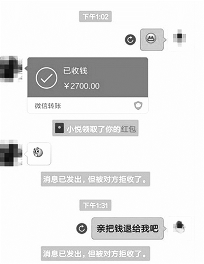 微信转账2700元以后,王女士才发现,原本要转给朋友的钱,被她错转给一个并不熟悉的微信好友了。而当她想让对方退还时,却被对方拉黑了……随着网络支付功能增多,类似王女士这样的情况并不鲜见,不少人都有发微信、发红包发错,充话费充错的经历,如果对方不归还很难追回。(10月10日《华商报》)