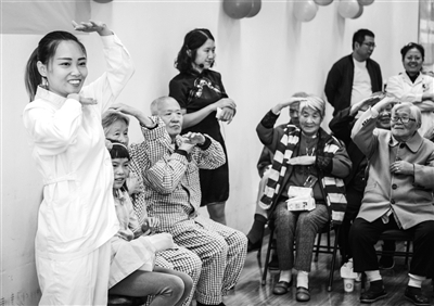 重阳节期间,北京市隆福医院分别在隆福医院本部、天通苑院区、北苑院区,为住院老人及附近养老院的老人举办了“情浓重阳,礼敬老人”联欢会,并通过小组康复训练,以游戏互动的方式,让老人在欢乐的气氛中享受康复的乐趣。图为康复师带领患者做互动康复操。本报记者 李一然 通讯员 赵帆晴 摄影报道