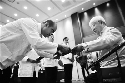 昨天下午,中国财贸轻纺烟草工会、中国商业联合会在北京权金城权品管理公司举行了一场简短又隆重的沐浴行业“名师带高徒”拜师仪式。来自沐浴行业的足疗大师刘连仲、修脚术传承者王建生等7位名师以及25位徒弟,现场进行了拜师礼。本报记者 彭程 摄影报道