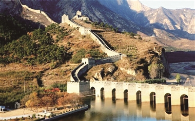 车子越驶越近,九门口长城开始清晰地跃入眼帘。绥中多山,九门口长城就建在崇山峻岭之间。九门口长城距山海关15公里,全长1700米,其南端起于危峰绝壁间,与自山海关方向而来的长城相接。据文献记载,九门口长城始建于北齐(公元479-502年),现存的九门口长城始建于明洪武十四年(1381年),其后又进行多次修复。之所以得名“九门口”,是因为在百米宽的九江河上,外用巨大条石包砌起8个梭形桥墩,形成9道水门,形成了“城在水上走,水在城中流”的奇异景观,因而享有“水上长城”的美誉。城桥上是高峻的城墙,城桥下是用方整的大石块铺成的河床,石与石间用铁腰咬合,形成规整的石铺河床,远望犹如一片石,故而九门口长城又被称为“一片石关”。