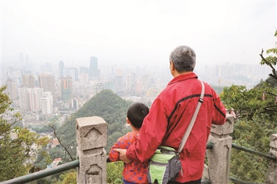 农历九月初九,是中国传统的重阳节,贵阳市民登上黔灵山,登高望远。黔灵山公园是国内为数不多的大型综合性城市公园之一,由六大浏览区构成。图为一位市民带着家人在黔灵山顶远眺贵阳市区。