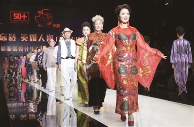 近日,2016年北京时装周开设的50岁以上的中老年模特时尚专场在北京举行。该活动是由建投享老50+携手著名国际服装设计师陈富美联合打造的,走秀的50多位中老年模特当中年龄最高的达84岁。图为中老年模特走秀。