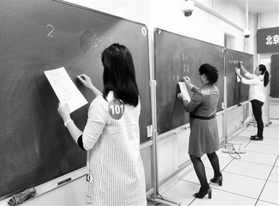 在如今的高校课堂上,虽然多媒体授课成为主流教学方式,但对于教师来说,粉笔字书写仍然是重要的基本功之一。为了检验教师的板书水平,近日,北京联合大学举行2016年教职工教学基本功(粉笔字)比赛半决赛,93名选手分成7组同台竞技,他们认真的应考态度,不亚于迎接大考的学生。