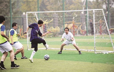 绿茵场上,8支4组足球队激烈对决,场内喊话、场外指导。10月中旬的天气,身着短衣短裤的球员也各个大汗淋淋。这是北京市园林绿化局“弘扬生态文明 喜迎绿色冬奥”主题系列活动足球比赛的现场。