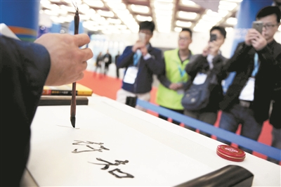 再往里走,老先生“王阳明”仿真机器人正在聚精会神的写着书法。这位“老先生”的书法不但能模仿明代学者王阳明的字迹,还懂得心理学,能解答人们的心理问题。刚劲有力的“知行合一”四个字写完后,“老先生”开始讲起国学,告诉观众什么叫做“知行合一”。工作人员告诉记者,这款机器人是中国传统文化和现代智能技术的结合体,当然根据需要,人物可以“私人定制”。