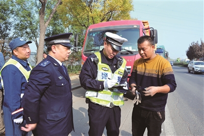 进入10月份以来,本市大货车违法事故频发,全市共现场处罚货车违法行为5.6万起。记者昨天从市交管部门了解到,下一步本市将开展货车违法综合治理工作,严厉打击货车、渣土车路面各类违法现象,整治行动将一直持续到年底。图为昨天上午,通州交通支队对过往的大货车进行整治。