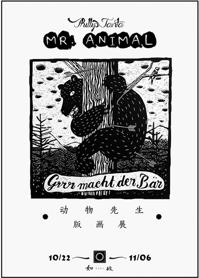 比如海报中被箭射中的大熊,尽管努力维持,但还是禁不住要从树上滑下来,并发出摩擦树干的“吱吱”声。画家把这个声音作为标题,让人好像真的能看到听到这个滑稽的瞬间。
