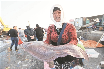 近日,一条近一米长罕见舌头鱼亮相山东青岛南姜戈庄码头,吸引了不少市民的目光,整条售价仅150元。进入秋捕旺季,渔村的大小船只来回穿梭于近海水域,早上出海下午返回,几十种小海鲜堆满渔村码头,形成热热闹闹的鱼市。