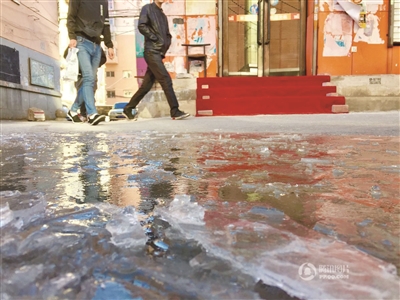 近日,辽宁省沈阳市,沈阳气温突降,最低气温达到零下10摄氏度,道路结冰,市民穿上棉衣,出行不便。图为被秋风吹落的叶子被薄冰封住。