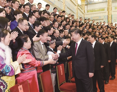 上午9时30分,习近平等来到人民大会堂金色大厅,同代表们亲切握手,并合影留念。
