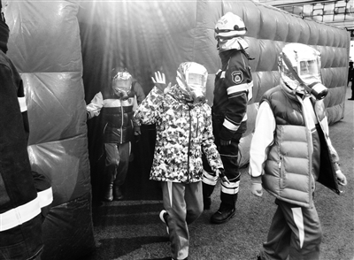 “低头、弯腰,顺着承重墙走……”昨天,崇文小学举行11·9消防宣传培训演练活动,全校学生佩戴呼吸面罩,从教学楼里疏散到操场。随后,六年级265名学生依次钻进逃生帐篷,体验火场实战逃生场景。