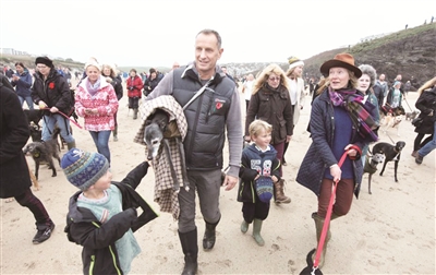 近日,在英国波斯海滩,数百名动物爱好者陪即将安乐死的高龄狗狗“小胡桃”进行最后一次散步,让它在快乐中离开。