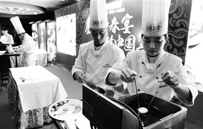 昨天,全聚德厨师在中国全聚德集团王府井店,展示了在参加荷兰鹿特丹举行的第八届中国烹饪世界大赛中,荣获大赛团体奖和四项个人奖的菜品制作。时近年末,全聚德集团所属34家直营门店,将于11月22日起,全面启动2017年年夜饭、新春宴的预售工作,这也是老字号餐饮品牌从赛场走向市场,把作品转化成产品的又一举措。本报记者 周世杰 摄影报道