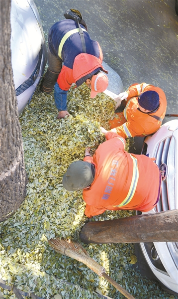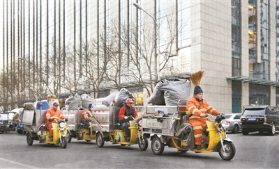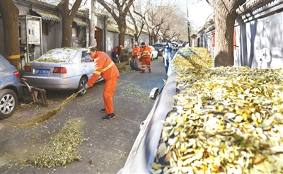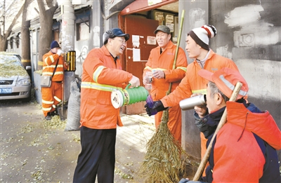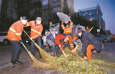 11月23日清晨4时50分,师徒俩最先来到清扫现场,查看夜间树叶的掉落量及街道上的清洁情况。5时10分,师徒俩挥起扫把和职工们一道开始清扫,然后把落叶装袋再运离转场……随着环卫车队的离去,身后留下的是整洁的街道。“11月是每年环卫职工最忙的月份,大风吹到地面的树叶和冬储大白菜、大葱上市,都给清扫工作增加了一定工作强度。”崔跃说,“通过我们的劳动,给市民创造一个整洁良好的生活环境,这正是我们环卫工人的价值所在。”