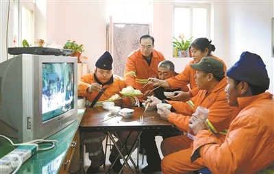 今年中秋节,家住大方家胡同东口的马振禄老人,端着一锅刚炖好的五花肉来到环卫职工驻地,感谢职工们的辛勤劳动,感谢大家在本职工作之外,为居民排忧解难做了那么多好事。老人找到崔跃和孙玉海激动地说:“劳动模范真是榜样,劳模带出的团队个个都是好样的,和你们做邻居太好了,是我们的福分。” 师徒俩年龄差异较大,性格和生活习惯也不尽相同,但他们却有着共同的愿望。62岁的崔跃至今仍坚守在环卫一线,以行动践行着自己要“当一辈子环卫工人”的承诺。孙玉海干脆把妻子、儿子和姐姐全都接到环卫队里,当上了环卫工人。孙玉海说:“我们全家人都是环卫职工,环卫队就是我们的家。”
