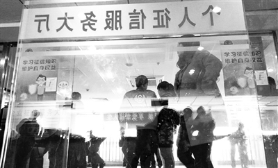 “需要贷款吗?”“需要抵押吗?”……昨天,记者在中国人民银行征信中心北京市分中心看到,不少办理业务的市民受到一些贷款公司的“骚扰”。一些放贷机构的代理聚集在此,电梯门一开,他们就会上前与办业务市民搭讪。本报记者 孙妍 摄影报道