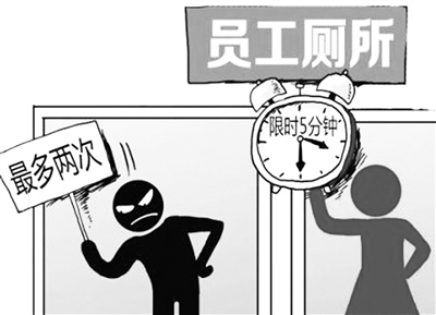 前不久,张丽接到了公司人事部发来的一张“200元罚单”,原因竟是上厕所超时五分钟。“公司限时上厕所的制度刚刚出台不久,我算是第一批受罚者之一了。”张丽说,公司之所以出台这个制度。据说是因为领导发现,有很多职工利用上厕所的时间,不是打私人电话,就是和同事一起聊天,或者是打游戏,影响了工作效率。
