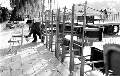 昨天,什刹海工作人员拉出封存近一年的冰车,进行修理和刷漆工作,为即将到来的什刹海冰上娱乐做准备。据介绍,什刹海冰场预计于12月中旬前后对社会开放。本报记者 孙妍 摄影报道