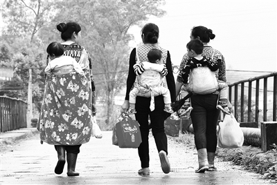 那天,我在路上看到三个女人背着孩子从市场逛街回来,并排走在回家路上。