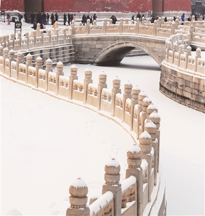 漫步于午门前宽阔的广场上,雪在脚下“沙沙”的声响,慢慢地领略,慢慢地品味,故宫之宽阔,殿宇之大气,白雪之晶莹,与历史之沧桑融为一体,使人感受到一种在其他任何地方难以体味的境界。踏着积雪穿梭在每一道宫墙之间,时间仿佛就这样凝固了,很多年前,是否帝后或宫女们也在这里抬头、驻足,欣赏紫禁城的雪景呢?