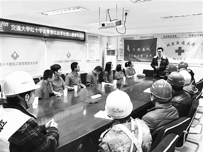 12月1日是世界艾滋病日。近日,北京交通大学“青春红丝带”社团带着100份红丝带健康包来到城建十六公司高梁桥商业金融大厦项目部,将防艾知识传递给施工现场的每一个人,提高他们的自我保护意识。通讯员 王猛 潘佳伟 摄影报道