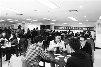 12月12日,海淀区职工第五届扑克牌“双升”比赛拉开帷幕。本次比赛共有来自26个基层工会的150多名职工报名参加。比赛邀请到专业的裁判员,严格按照赛事规则,并提供了有力的后勤保障。最终,海淀置业三队和超市发二队获该赛事第一名。