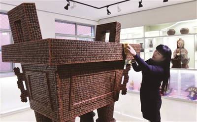 虽然在采访前就有心理准备,但是走进徐秀玲的办公室,记者还是惊讶于眼前这些琳琅满目的艺术品。大到两米多高的“花瓶”、一人多高的大鼎,小到桌椅板凳、首饰盒、地球仪等工艺品竟然都是由一片片核桃拼接而成的。细看一艘长约一米的帆船,船体构造惟妙惟肖,甲板、船舱、舱室、桅杆、船帆一应俱全,甚至连栏杆、船锚等细节都未被遗漏。明代的核舟以其高超的技术让人叹为观止,今天徐秀玲的这些核艺也足以令人大开眼界。