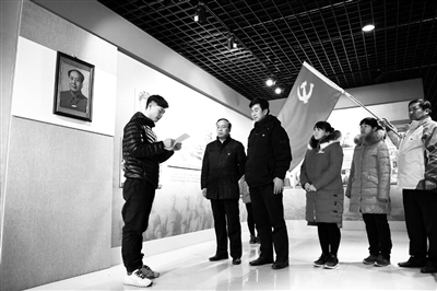 昨天,延庆疾病预防控制中心党支部组织全体党员来到大庄科开放式红色体验基地,以“踏寻红色足迹”的方式纪念伟大领袖毛泽东诞辰123周年。当天,在平北红色第一村的展馆内,该中心职工卫一激动地向党组织递交了入党申请。本报记者 陈艺 通讯员 贾德勇 摄影报道