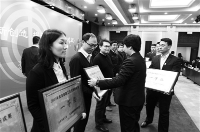 在首届京津冀职工职业技能大赛中,北京队翟利龙等11名选手获表彰。图为职工优秀创新成果颁奖现场。彭程 摄